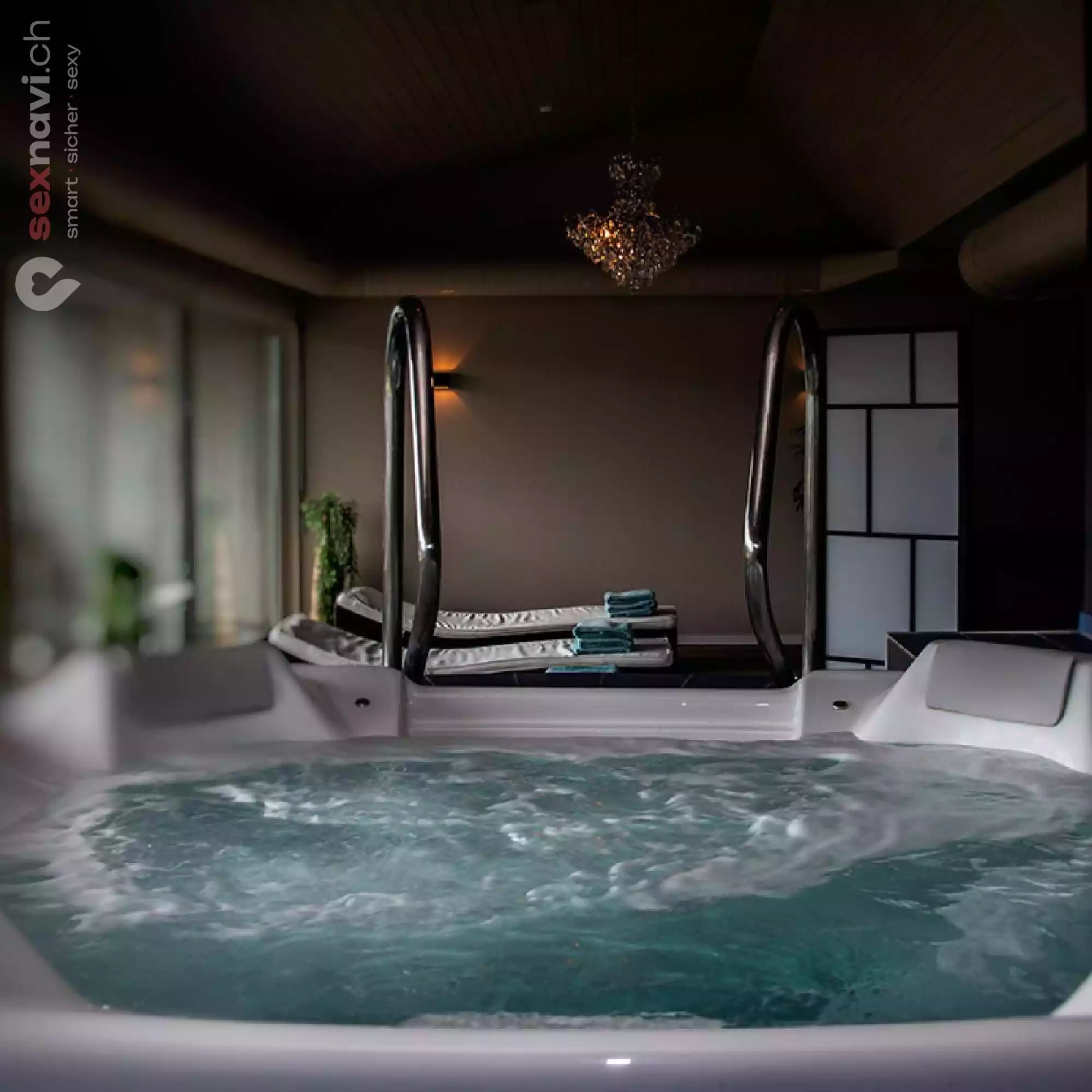 Im Whirlpool mit Massagedüsen werden Deine Verspannungen gelöst. Dabei hast Du einen perfekten Ausblick auf unsere Ladies.